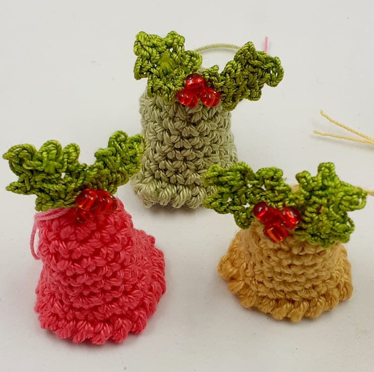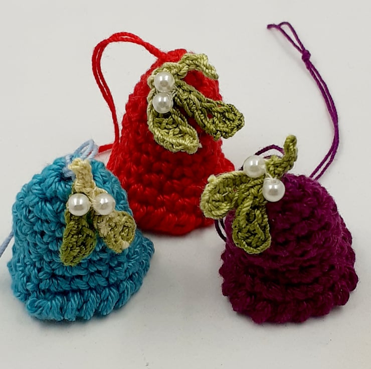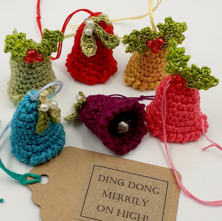 These six colourful little bells would add festive cheer to any tree! They are crocheted in cotton and really jingle due to the tiny bell dangling inside. They are crocheted in cotton and three are decorated with a tiny sprig of mistletoe with a faux pearl berry and are decorated three with a tiny holly leaf with glass bead berries. Each bell measures approximately 3.5 cm tall and has a loop of crochet cotton to hang it by.