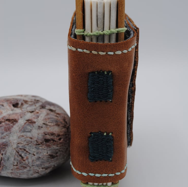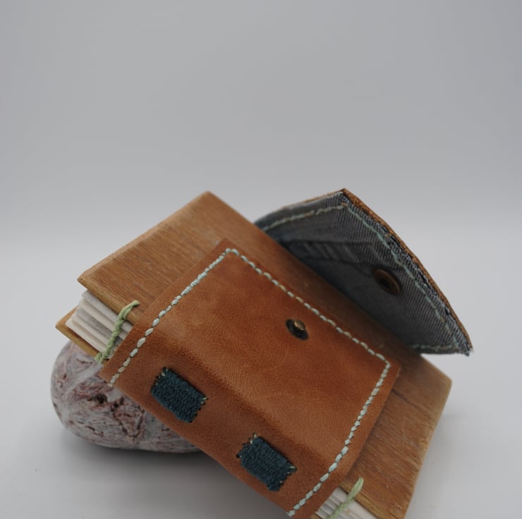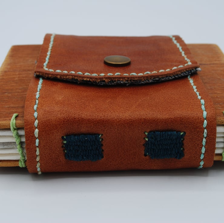 The covers are made from salvaged plywood (this may slightly vary to photograph) and the wrap around enclosure is from salvaged off cuts from a leather sofa manufacturer (leather is chrome tanned). I lined the leather wrap-around enclosure with thick canvas cotton (purchased) fixed by hand sewn saddle stitch. The enclosure is secured by a gun metal colour popper fastener.