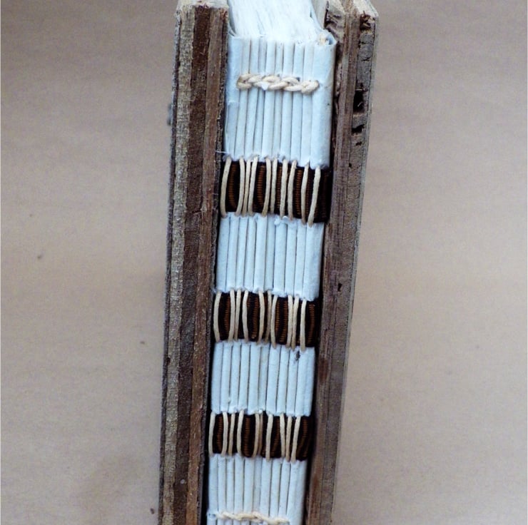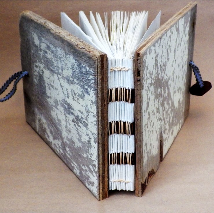 This hand bound journal was made by traditional methods, the paper was made and cut by hand and then stitched. The covers are made from driftwood (washed up boat wood)- that is 'sea battered' plywood- revealing various layers.