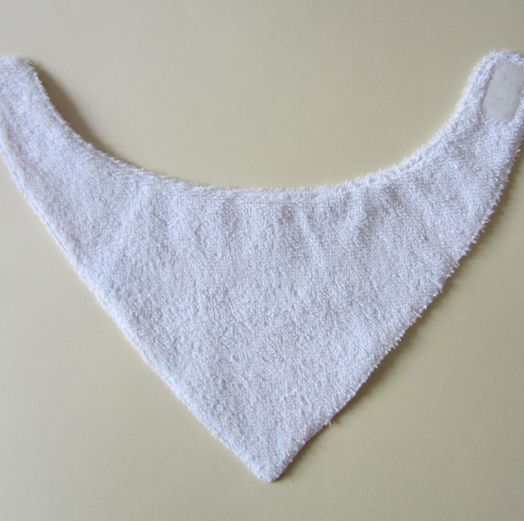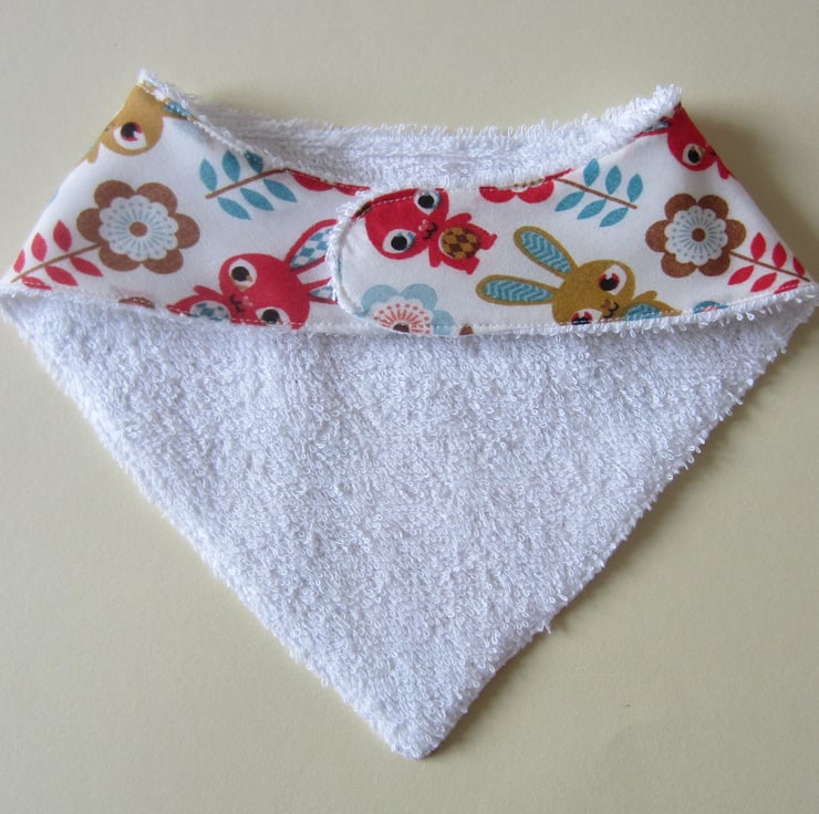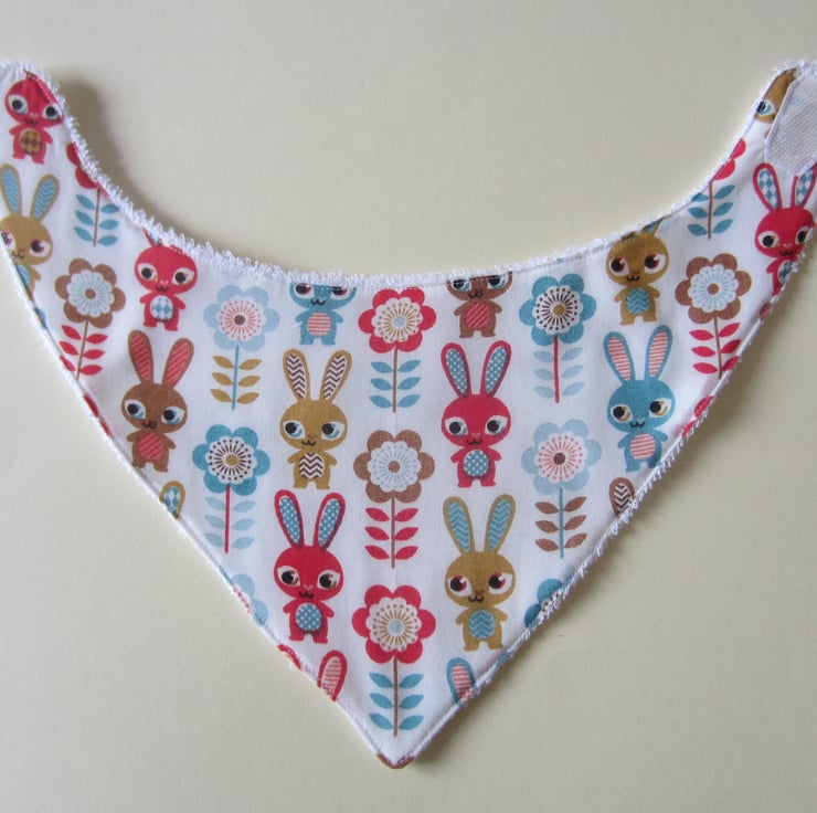 Babies bandana bib in cute bunny rabbit fabric, backed with soft white towelling for extra protection. At the back there is a 3.5 cm velcro fastening to give a good fit.