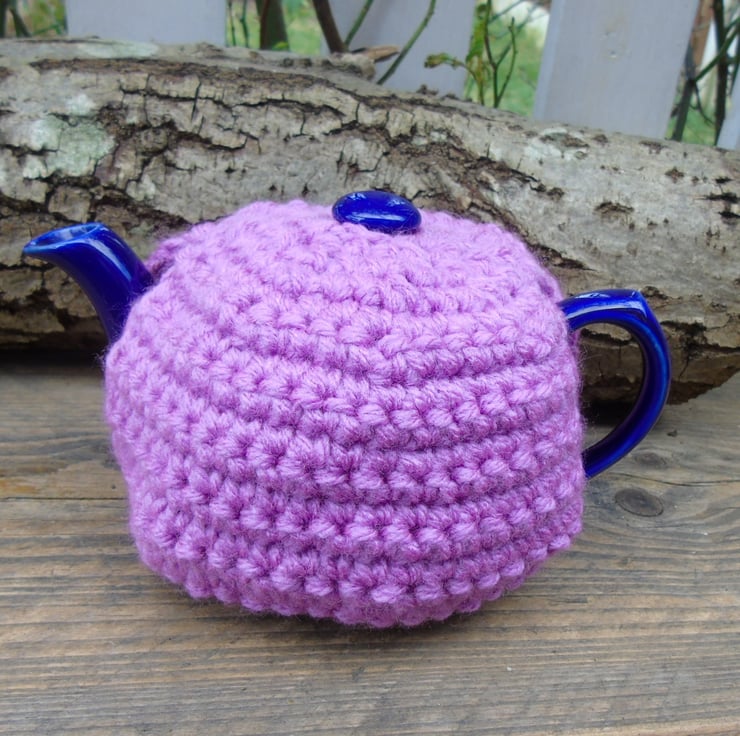 This is a small one cup tea cosy crocheted with two strands of deep pinky mauve acrylic yarn making it a nice thick cosy to keep your tea hot.