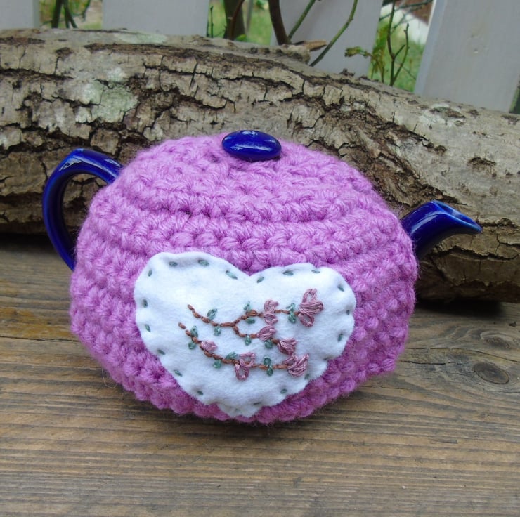 I have hand embroidered a branch of blossom onto a plain white heart and hand stitched it to the front of the cosy.