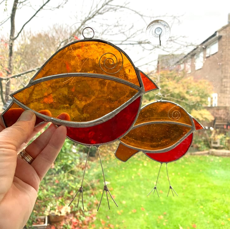 This has been made from amber sea glass, red sea glass and orange water glass for the beak. Tinned wire has been used for the eye and legs.