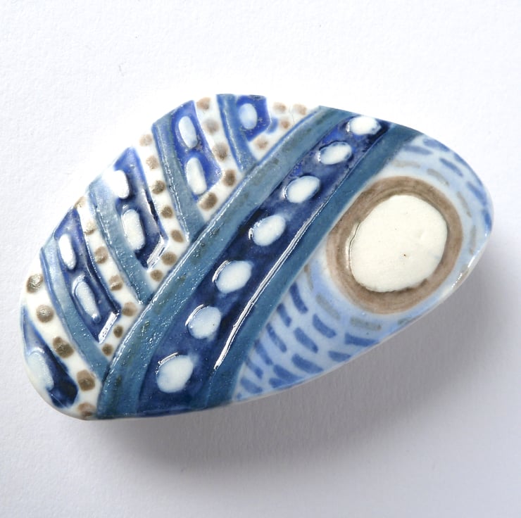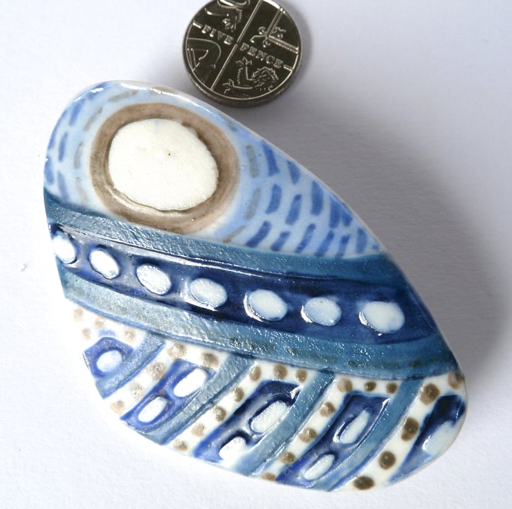 Using rich colours under a matt glaze, the surface is smooth to the touch . The brooch is signed on the back.