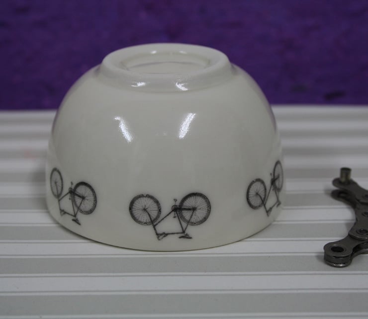 A small porcelain bowl hand thrown on the potter’s wheel with a hand turned base. Decorated with bicycle motifs around the rim. It measures approximately 8cm diameter at the rim and 5cm high. The bicycle transfers are fired on at 800 degrees centigrade which is a third firing. The item is fully dishwasher, microwave, and oven safe. Or it can be just used as a small storage vessel!