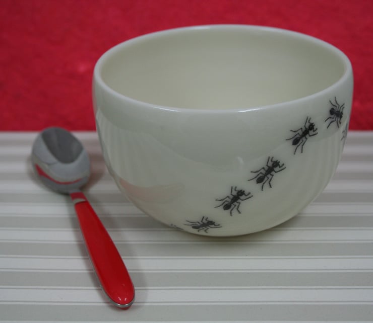 A small porcelain bowl hand thrown on the potter’s wheel with a hand turned base. Decorated with ant motifs up and down in a loop running around the bowl. It measures approximately 10.5cm diameter at the rim and 7cm high. The ant transfers are fired on at 800 degrees centigrade which is a third firing. The item is fully dishwasher, microwave, and oven safe. Or it can be just used as a small storage vessel!