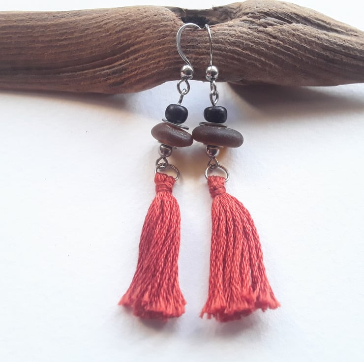 Gorgeously swingy and light tassel earrings, made from hand-drilled seaglass nuggets, with black beads, stainless steel disc additions...and finished with handmade, silk thread tassels.