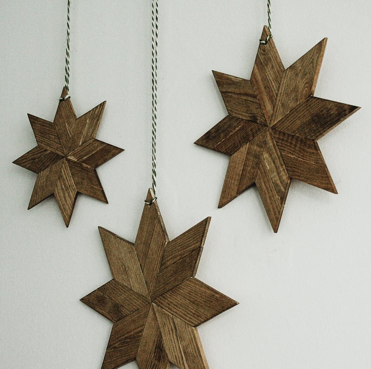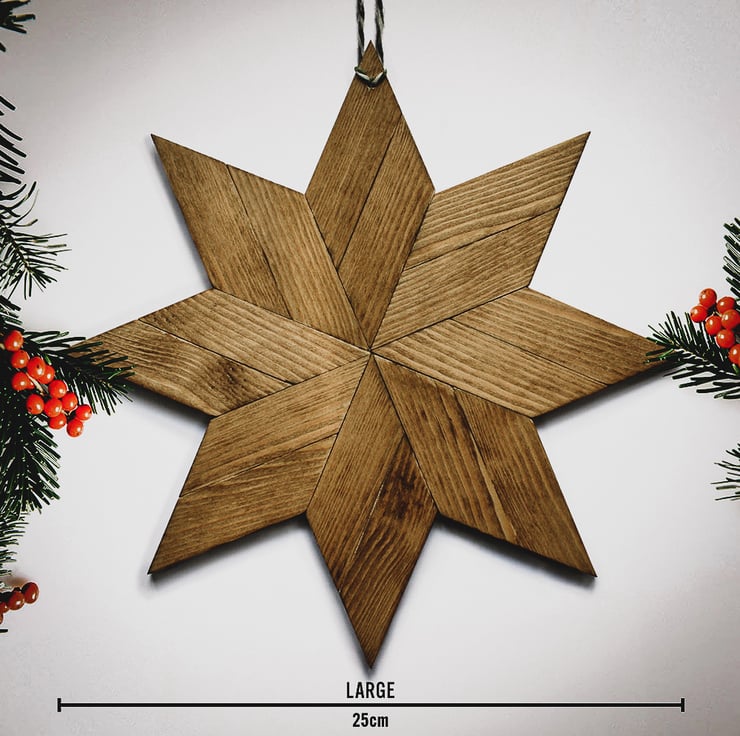 Set of 3 small, medium & large beautiful, contemporary handmade wooden stars, perfect for hanging as part of your Christmas display but equally stunning all year round. Each star is crafted from 4-6mm pine, each section carefully selected to give your star it's unique appearance. They are hand cut and finished by me, a real labour of love. These Scandi-style ornaments are available in two finishes.
