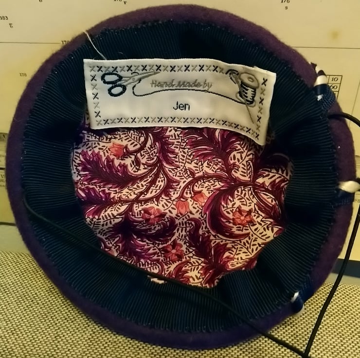 A small purple button beret with blue & white ribbon decoration. Handblocked, handstitched, couture piece easy to wear with hat elastic for a glamorous look with hair up or down. Lined in Liberty paisley fabric.