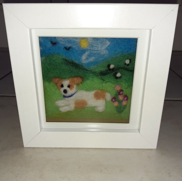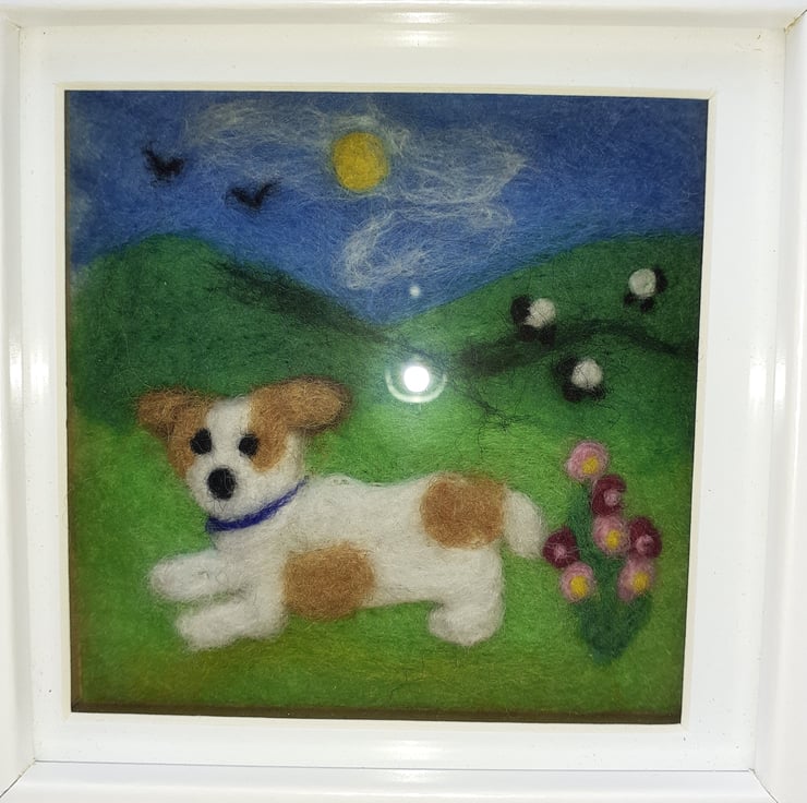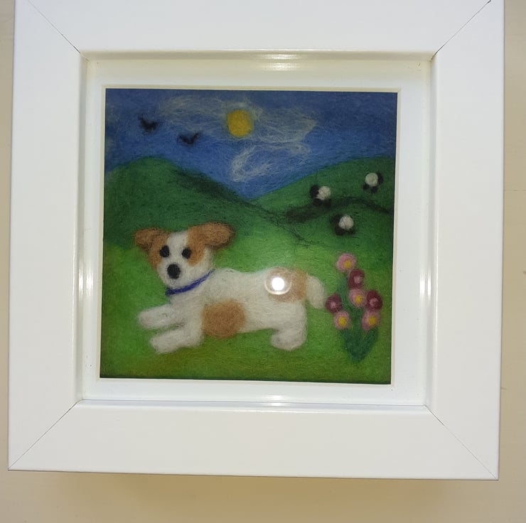Handmade, needle felted brown and white dog with a blue collar playing in the green fields. Light and dark pink flowers in the foreground. Three little sheep in the background on the hill. A sunny day with blue sky, sun shining, wispy white clouds and two birds high in the sky. Framed in a white box frame, can stand alone or has a wall hanging fixed on the back. 12cm by 12cm frame, depth 3.5 cm