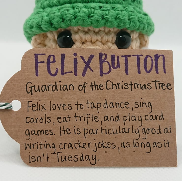 Felix is made in 100% cotton yarn, safety eyes, fibrefill, stands approximately 12cm tall, and is CE Tested.