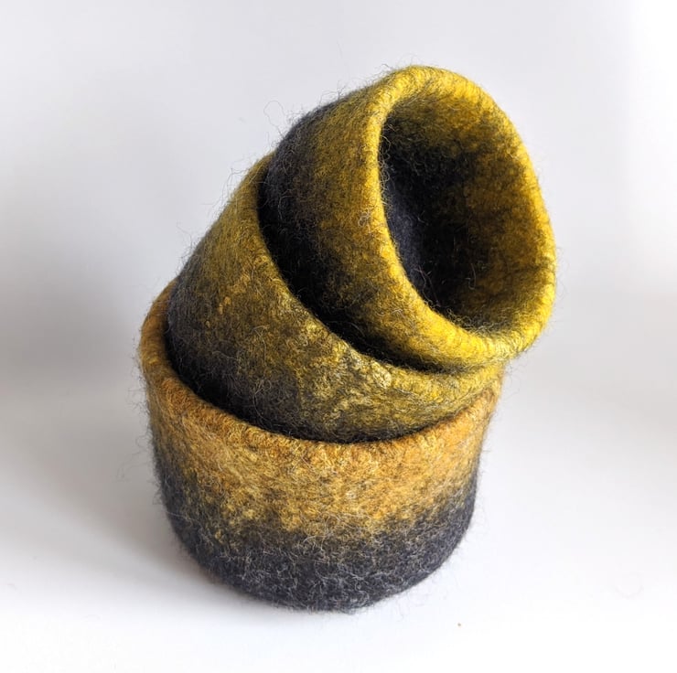 This trio is made from a tweedy grey merino wool and three toning shades of yellows wet felted together, and embellished with silk fibres for highlights and depth, to create an almost ceramic looking felt.