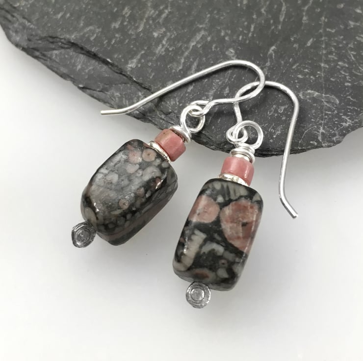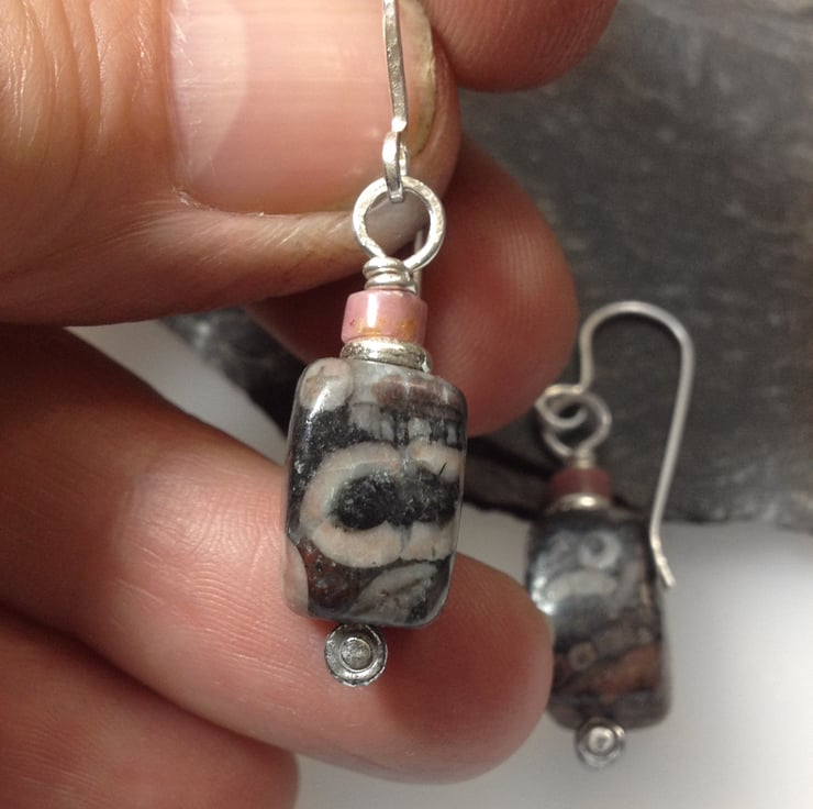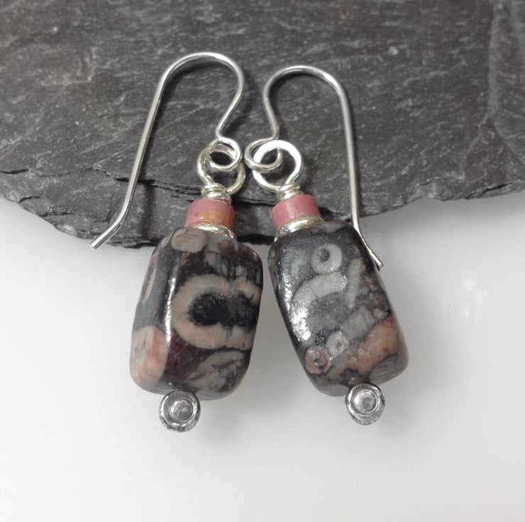 I have teamed some rectangular crinoid marble fossil beads with some dusky pink rhodocrosite.