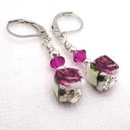 Pretty semi-precious gemstone earrings that feature rose quartz and hot pink crystal bicones.