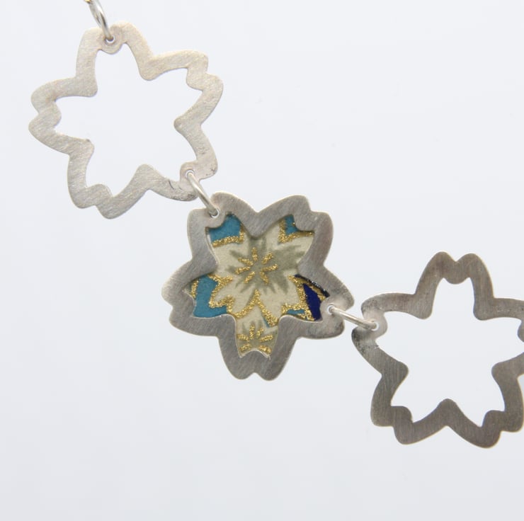 This statement necklace is made from hallmarked sterling silver with a brushed/satin finish. A unique piece of Japanese Chiyogami printed paper is caught under a protective layer of crystal clear resin.