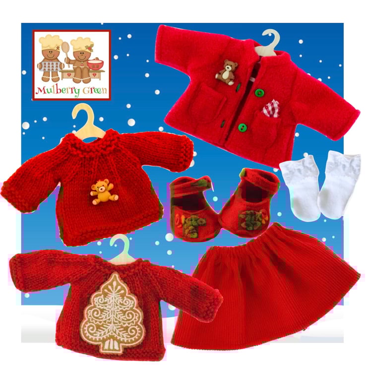 A cute little red fleece jacket to fit the Mulberry Green characters. The jacket has two cute little pockets and is decorated with a little teddy bear. It is finished off with two little green buttons and a gingham handkerchief in one of the little pockets. The jacket comes on a little wooden hanger.