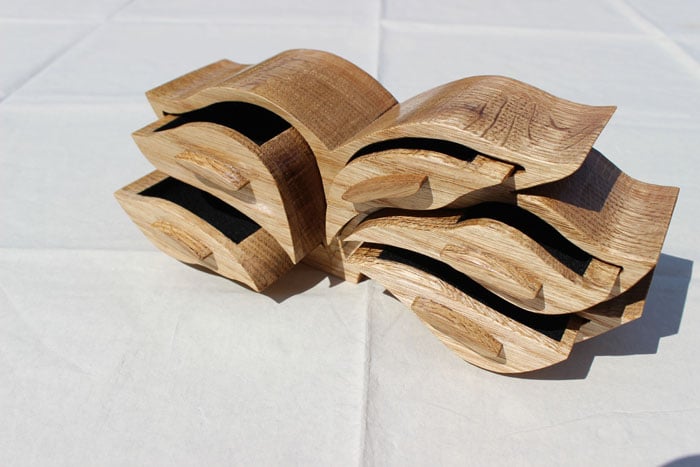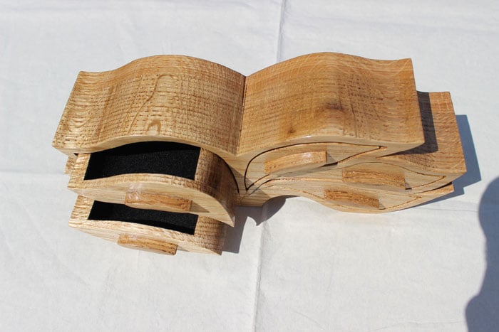 A distinctive jewellery or trinket box with five draws designed in a leaf pattern. The box is made from oak wood and coated in drying oil providing a durable deep satin finish. The draws are lined in soft, black coloured flocking.