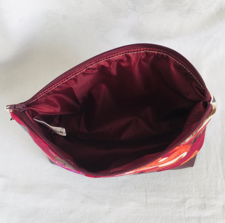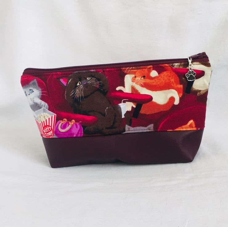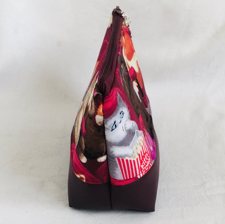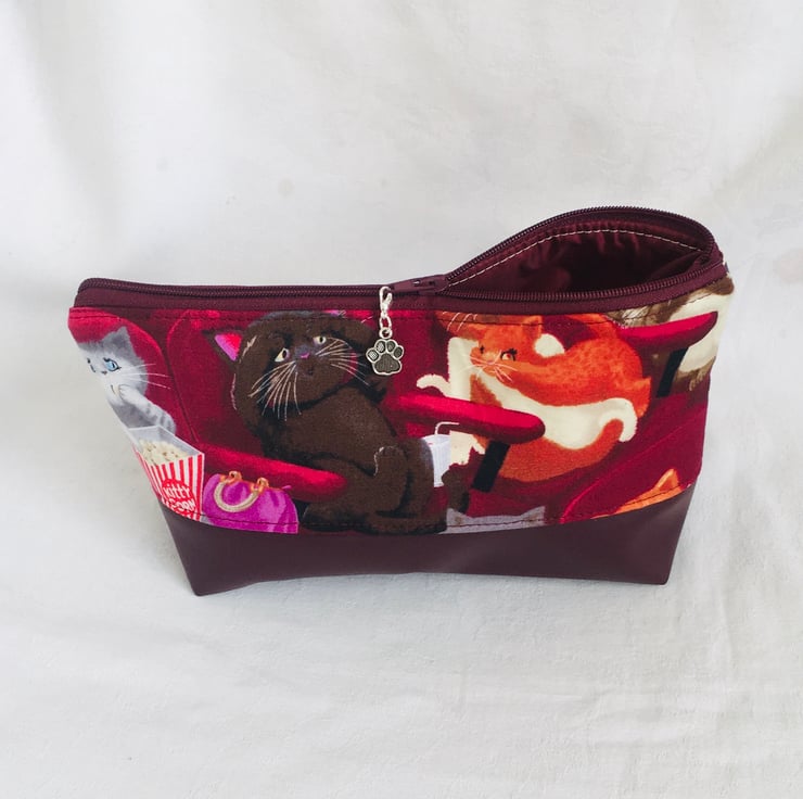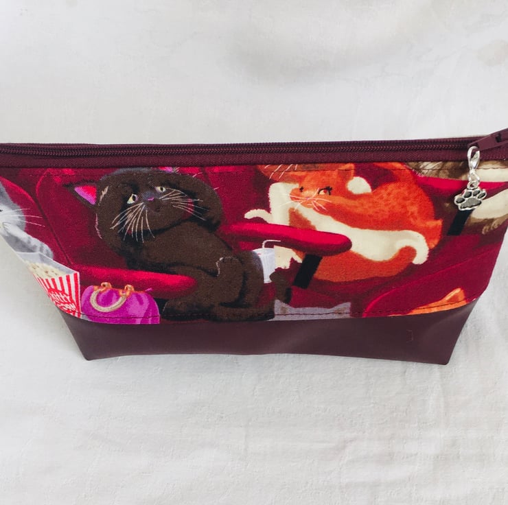 Why not treat yourself or someone special, to this cute, fun Cats at the Cinema make-up/small wash bag or a pencil case. A great compact zip bag to put your essentials in to take with you. This bag looks stunning a real eye-catcher, whilst being practical and functional. This bag has been made from cotton fabric with Cats printed on the outside at the top, with maroon faux leather at the base and finished with waterproof lining for ease to wipe clean. A real unique, one of a kind and stunning looking bag.