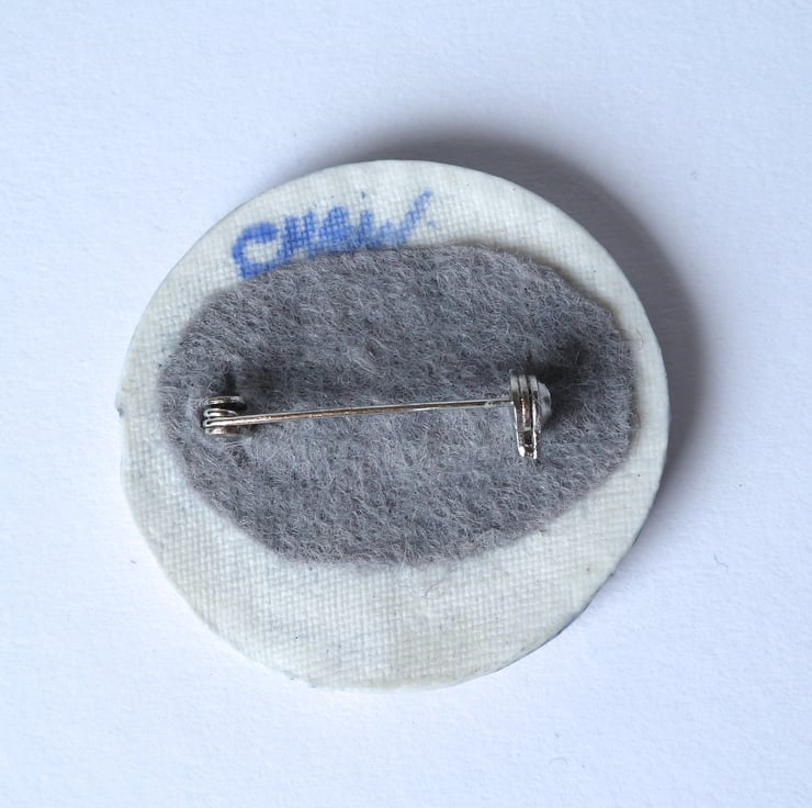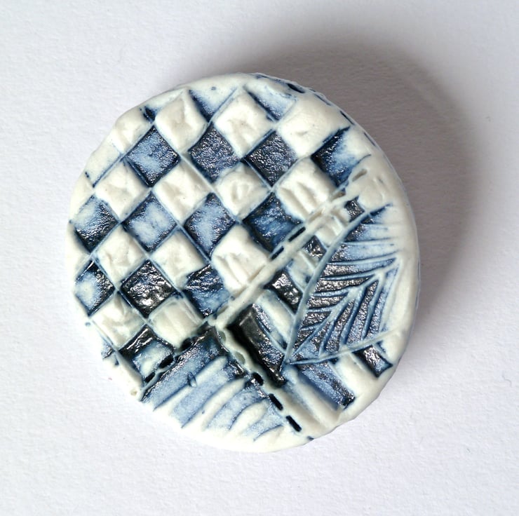 This unique little porcelain brooch, hand made by Linda in her studio in Winchester, has an impressed pattern, giving a rich textured design in Prussian blue and white.