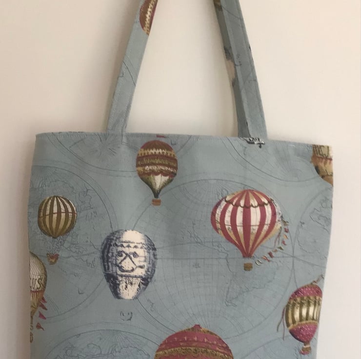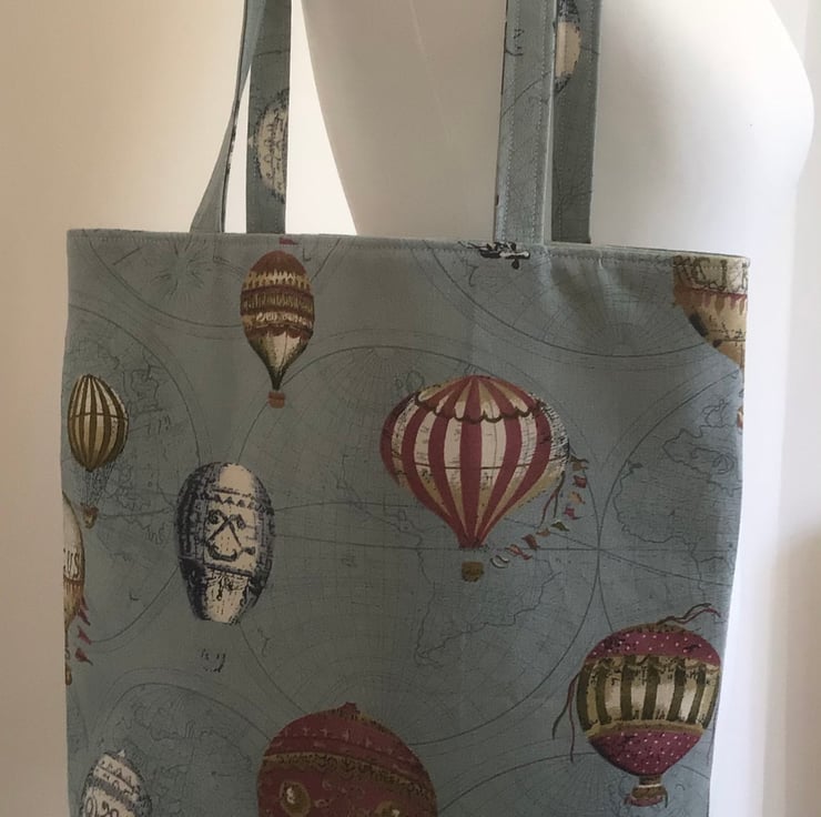 A cotton canvas duck egg blue tote bag featuring vintage style hot air balloons.