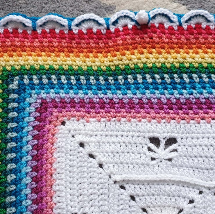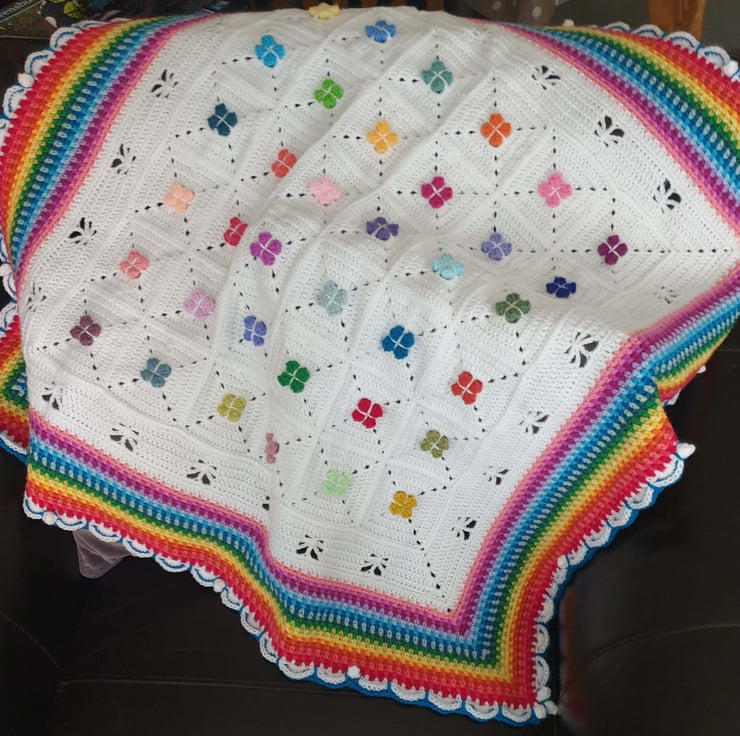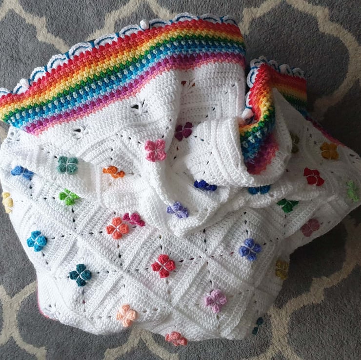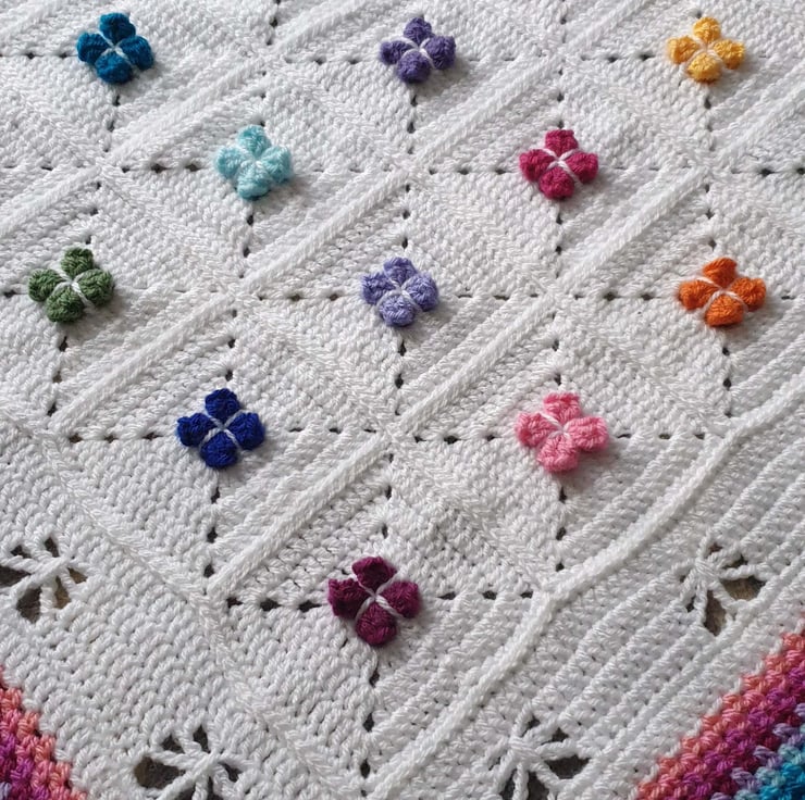 This colourful crochet baby blanket is made in 100% super-soft double knit acrylic yarn, particularly cosy for those with sensitive skin. The little popcorn flowers add a lovely pop of texture to the blanket.