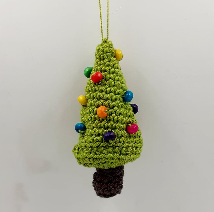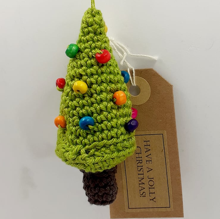 This bright tree decoration is perfect for wishing someone a happy Christmas this year and will make a cheerful addition to the tree decoration for many years to come. It is crocheted in cotton and filled with polyester stuffing. The baubles are brightly painted wooden beads. The tag reads 'Have a Jolly Christmas' on one side and is blank on the other for your own message. The tree measures approximately 9cm tall and hangs from a strong cotton loop.