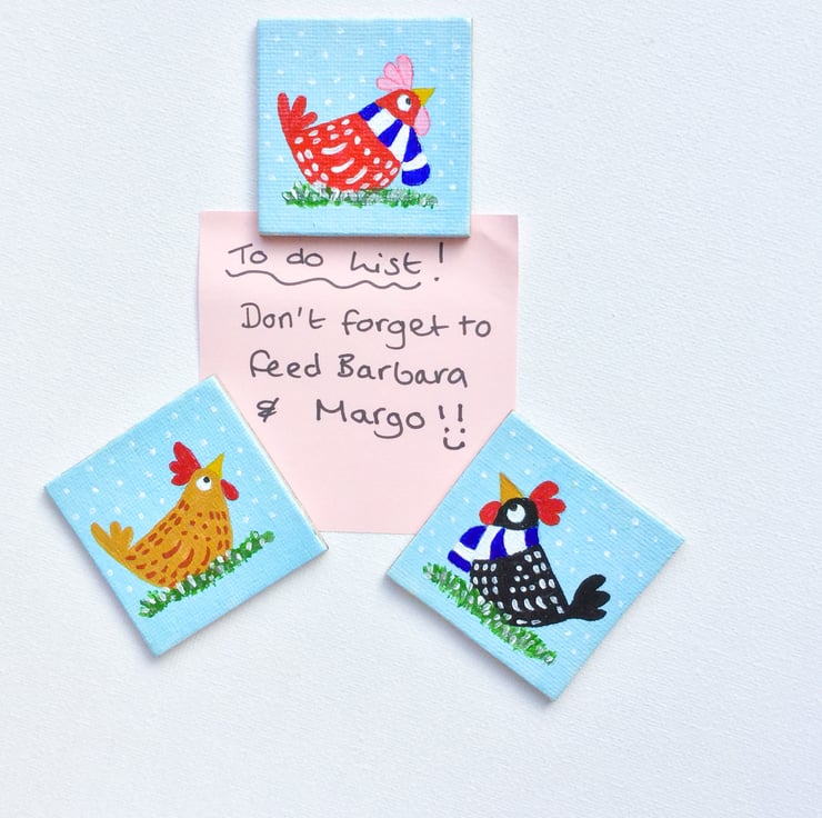 A hand painted design showing a tiny chicken. Each magnet has been sealed with a coat of gloss varnish for added protection.