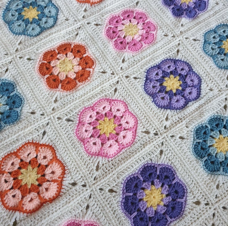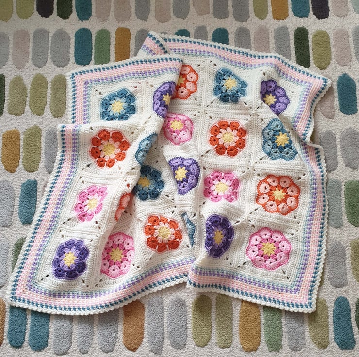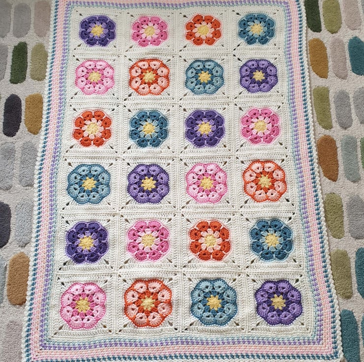 This colourful crochet baby blanket is made in the African Flower motif and is made up of 24 squares.