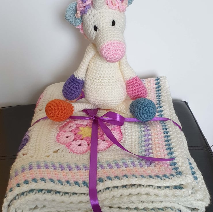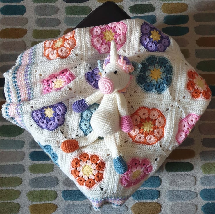 African Flower Crochet Baby Blanket and Unicorn teddy