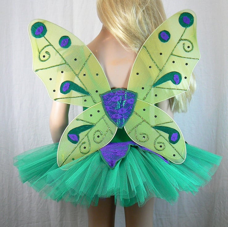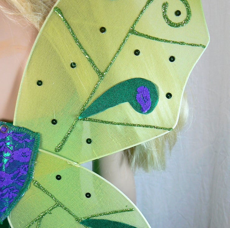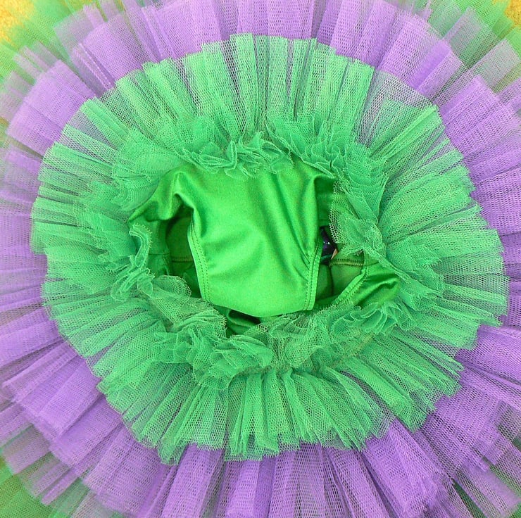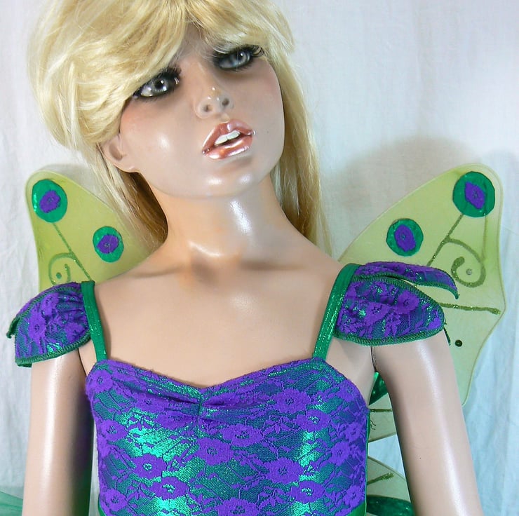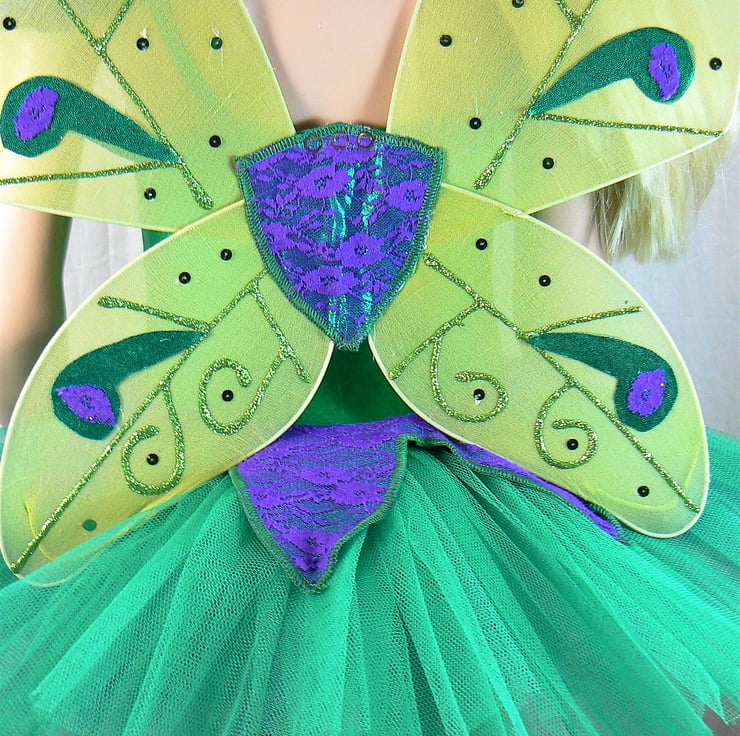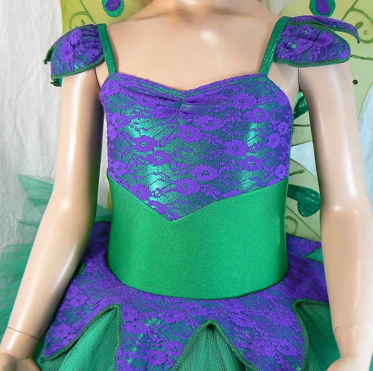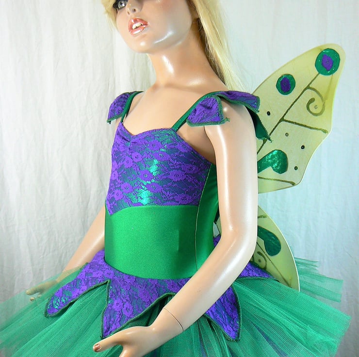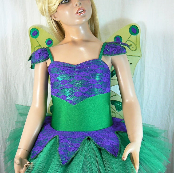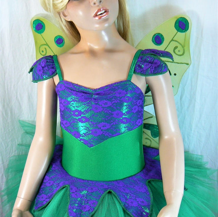 Fairy tutu costume with detachable wings . This all in one tutu I have made in emerald green Lycra with top section of the body , petal overlay skirt and petals on the straps in a shiny foil Lycra overlaid with purple lace. The wings are attached with three poppers. Under the petal overlay there are 6 layers of net in emerald green and purple.