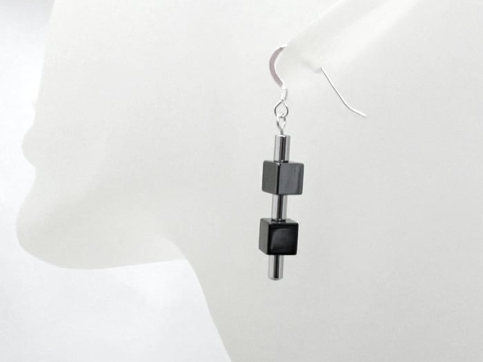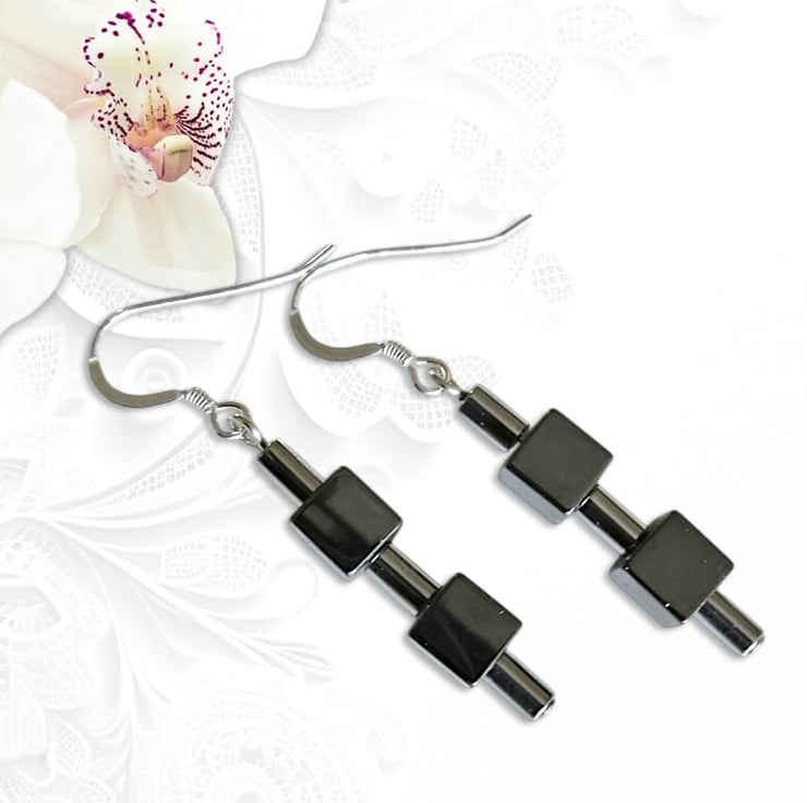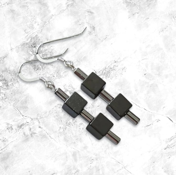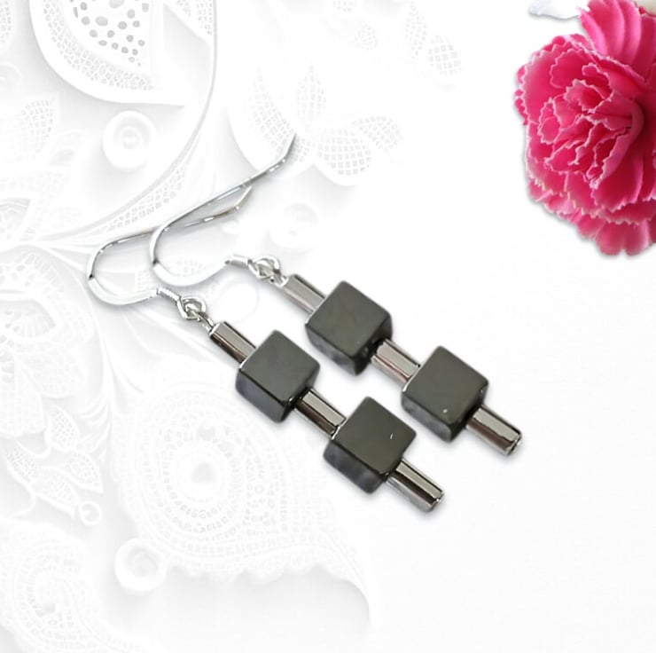 These medium chunky ladies Hematite semi precious gemstone handmade earrings are geometric in design.