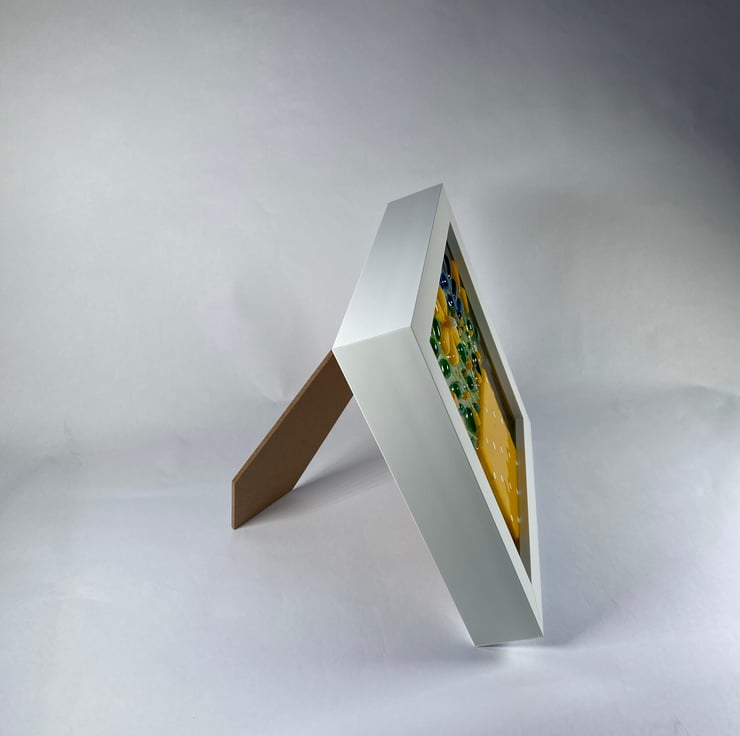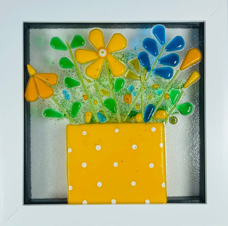 Fused glass modern retro style design based on the 1970s era . Bright and colourful . Beautifully reflects the light back into the room . The beauty of fused glass is the vibrancy of colour which will never fade . Frame us 15cm square . Can be wall mounted or stood on a side .. makes a lovely home addition . If you are a lover of retro style this is for you ! .