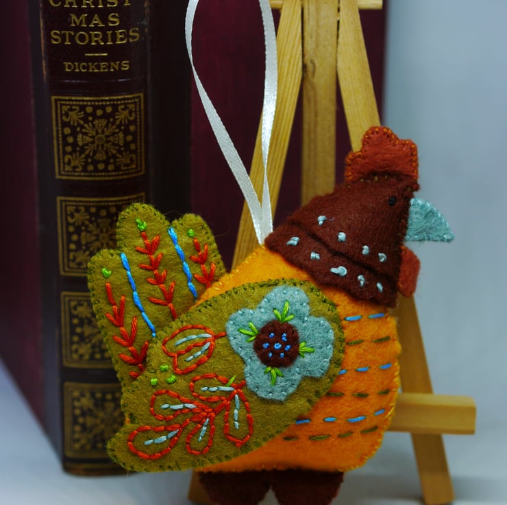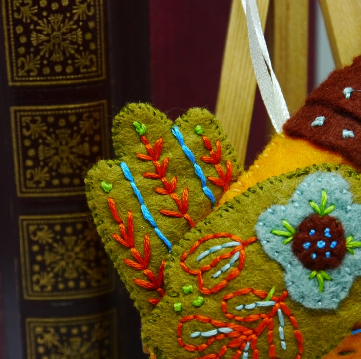 Lovingly hand stitched and embroidered felt ornament with narrow satin hanging loop would look great adorning the Christmas tree or anywhere as part of your festive display also idea as a present for the person who is always on the lookout for something different. Each ornament is lightly stuffed to give shape.