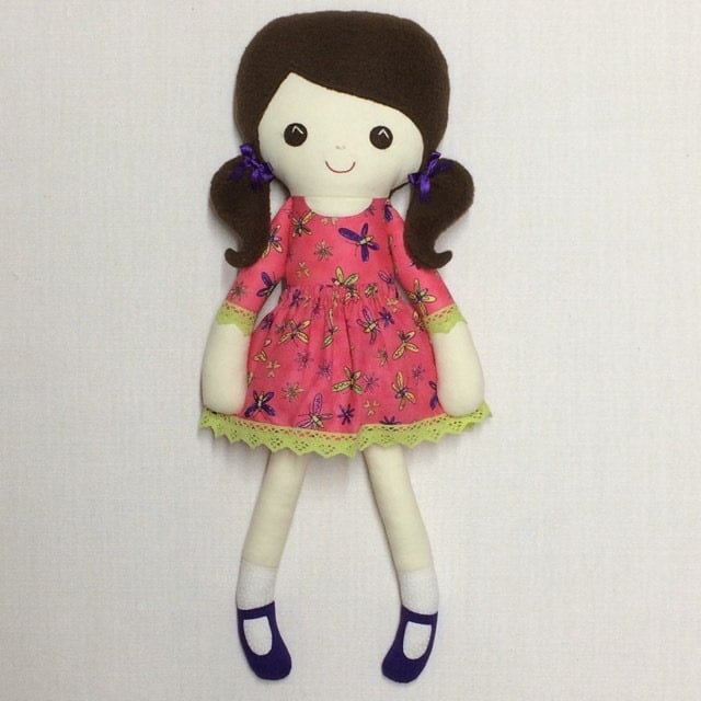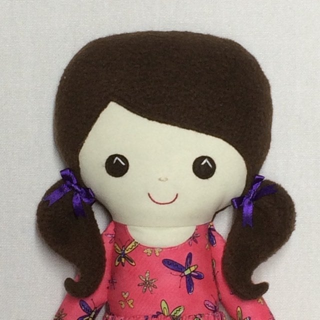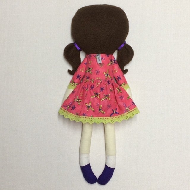 Her dark brown hair is made from soft fleece and worn in bunches fastened by purple ribbons bows. She has deep brown eyes which are made from felt. Her red mouth and tiny nose are securely hand embroidered