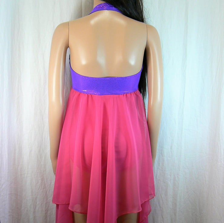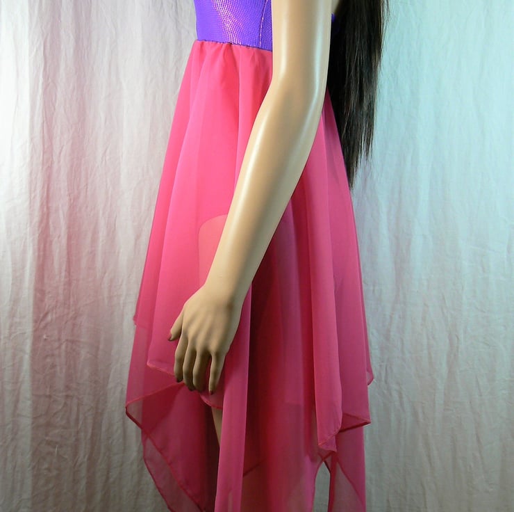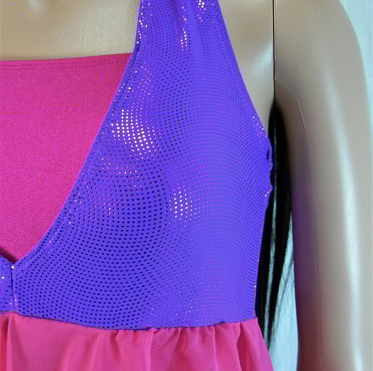 This is a halterneck leotard with built in chiffon handkerchief skirt. The camisole empire line leotard is in cerise Lycra with a halterneck in purple Lycra with a cerise on. The cerise chiffon handkerchief skirt is built into the empire line.