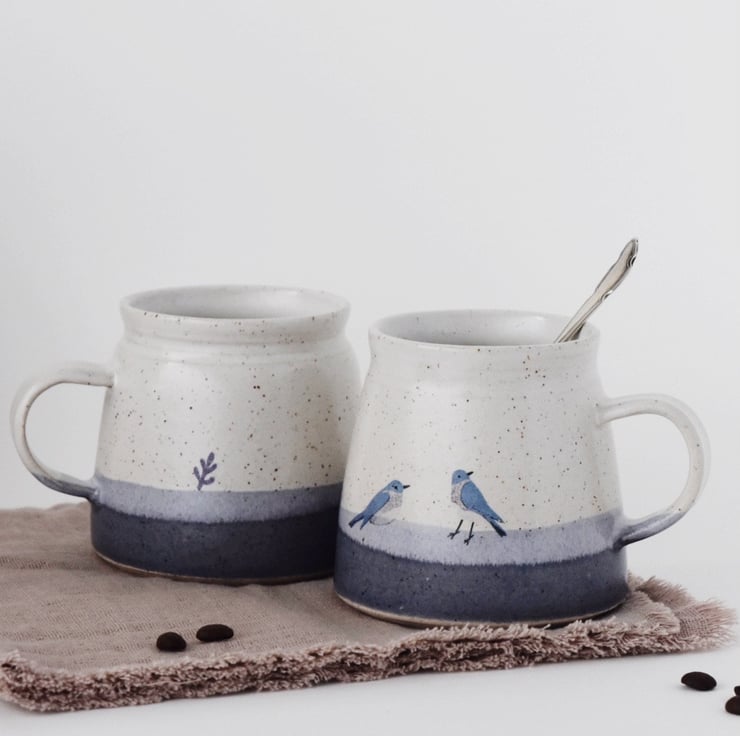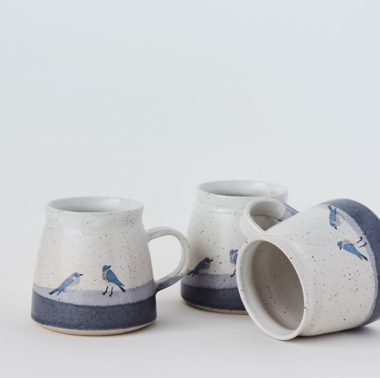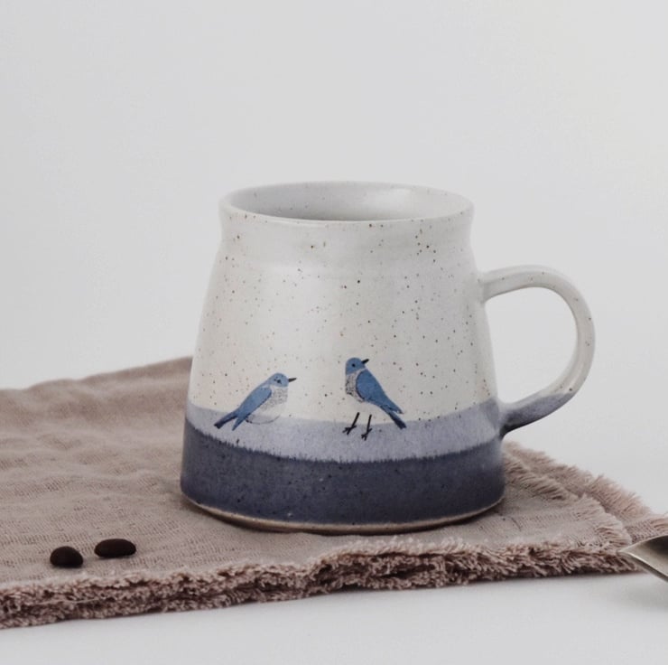 A blue and white handmade ceramic mug with hand-drawn bluebird illustrations. Thrown from fine stoneware clay, you can be certain that it will make hot drinks - coffeetea - taste divine. A great gift for lovers of birds and ceramics.