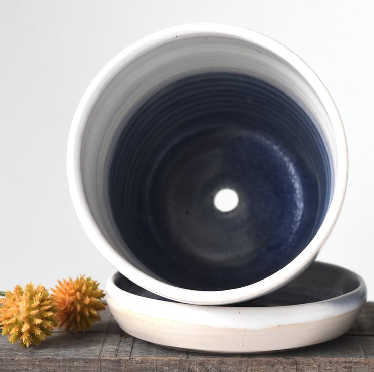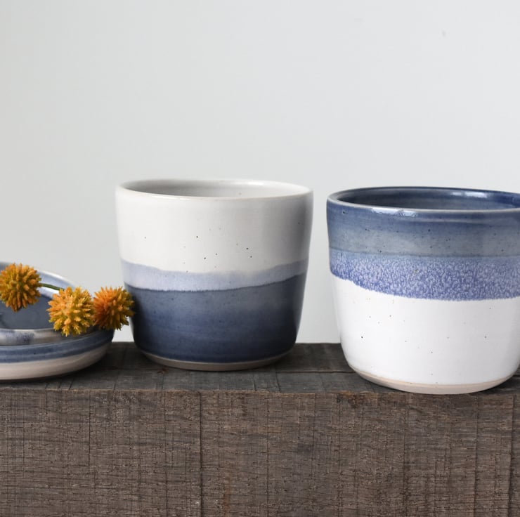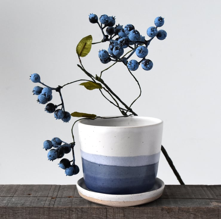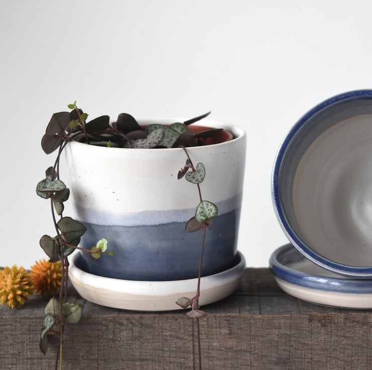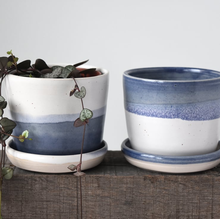 Glazed in varying blue and creamy white bands with our maker's mark at the base, these planters with their matching saucers make beautiful gifts for plant-lovers and will look lovely on the window sill holding succulents, houseplants or herbs of your choice.