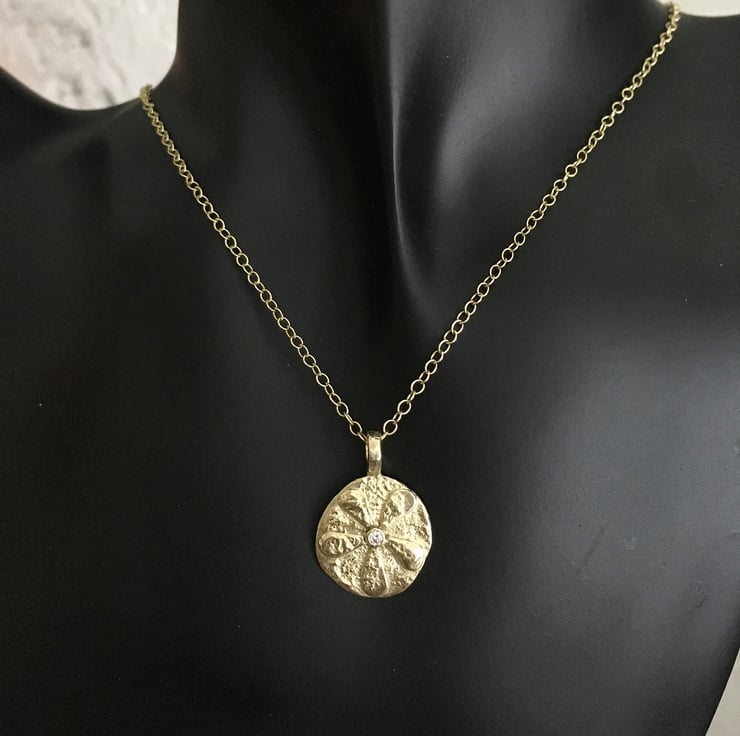 The flower pendant has an almost circular base with molten, textured petals and a small stone set centre. The metal has been given a bright burnished finish.