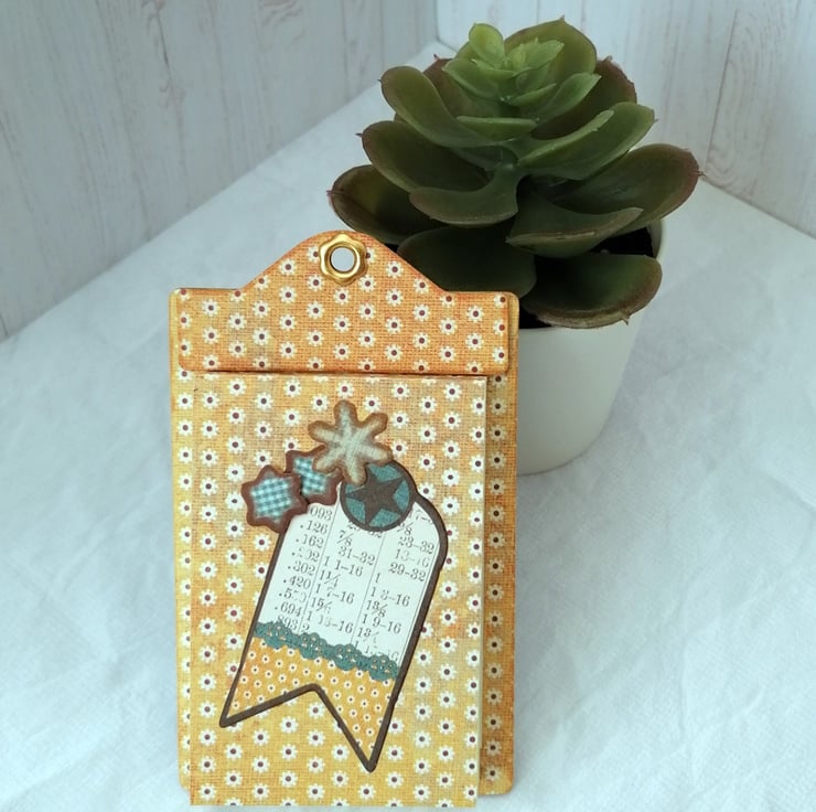 It has an eyelet at the top so can be hung up and a magnet on the reverse.