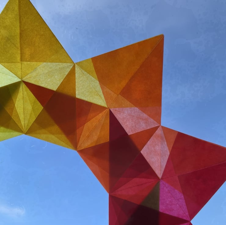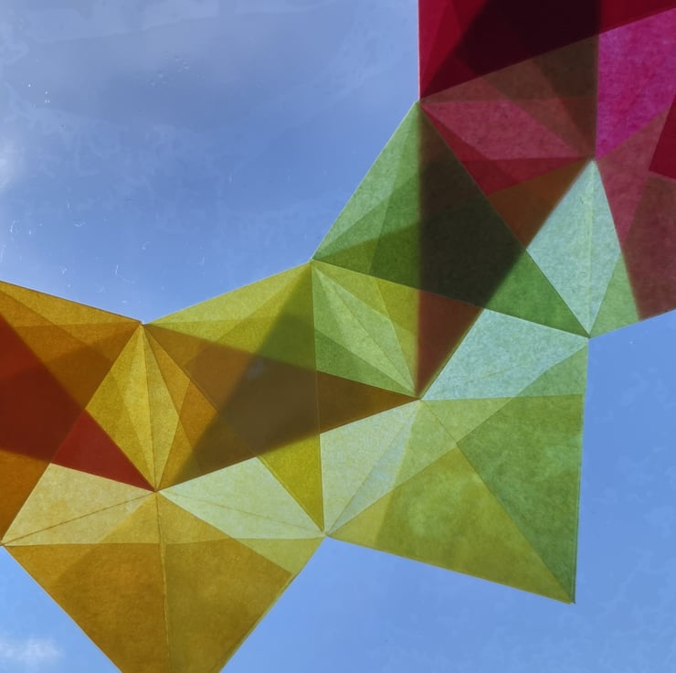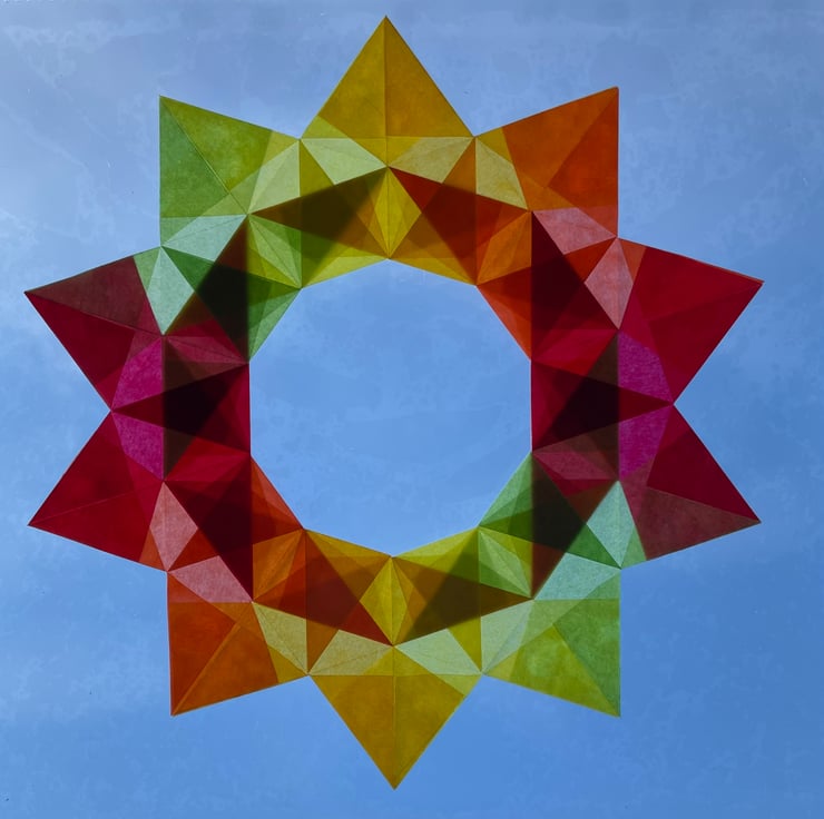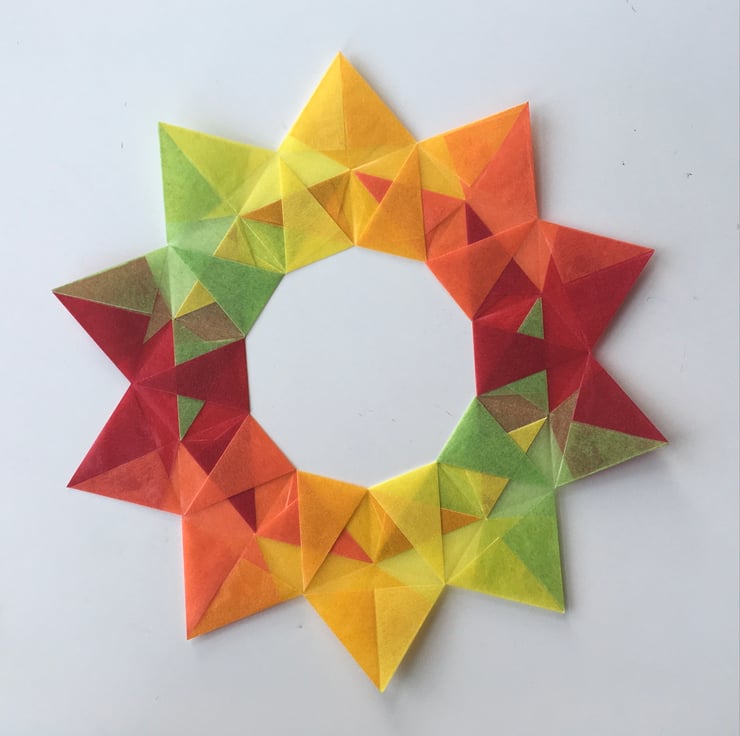 This colourful folded paper Window Star Wreath is especially lovely during the winter months. Each folded decoration has been carefully hand made by me using transparent waxed kite paper. This Star Wreath is made up of 10 separate stars carefully cut and folded, then joined together with a touch of glue and measures approximately 19.6cm across. This colour way is Tilly.