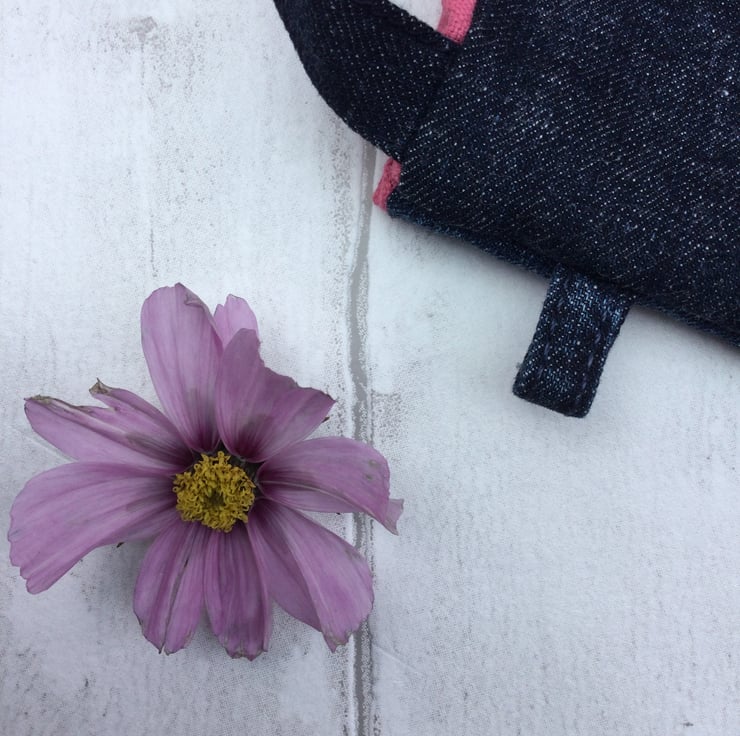 The body of the bag is made using repurposed denim and is lined in a lovely co-ordinating raspberry pink furnishing weight cotton. The bag is finished with a denim tag and buttons and has horizontal seam detail on the reverse.