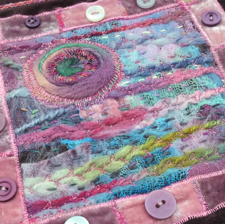 This one-off tote style bag features a richly textured central textile panel created by me using a variety of materials including wool, dyed velvet, cotton velvet and hand dyed scrim. The techniques I've used to create it include needlefelting, hand and machine embroidery and couching.