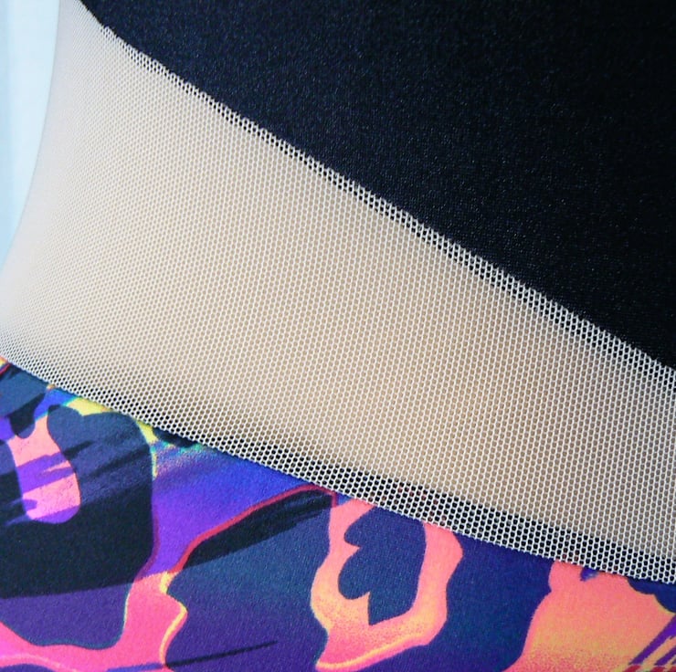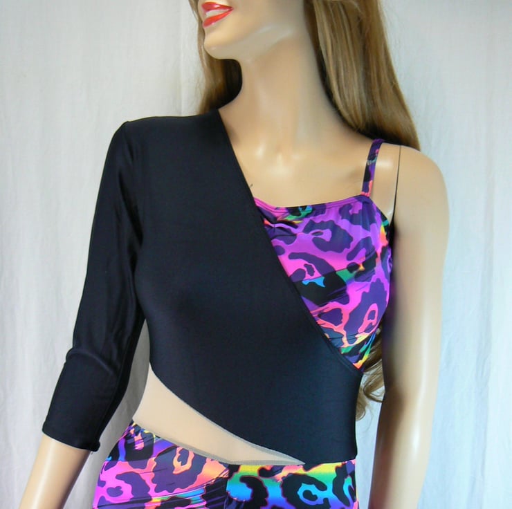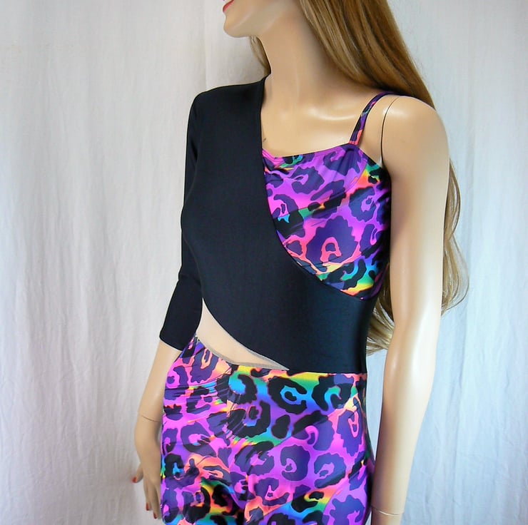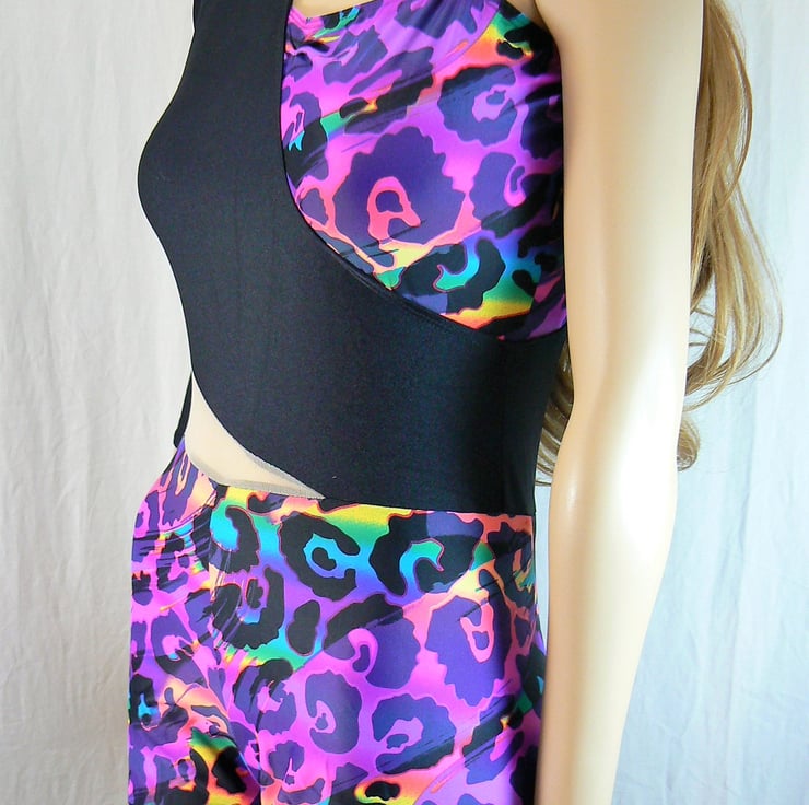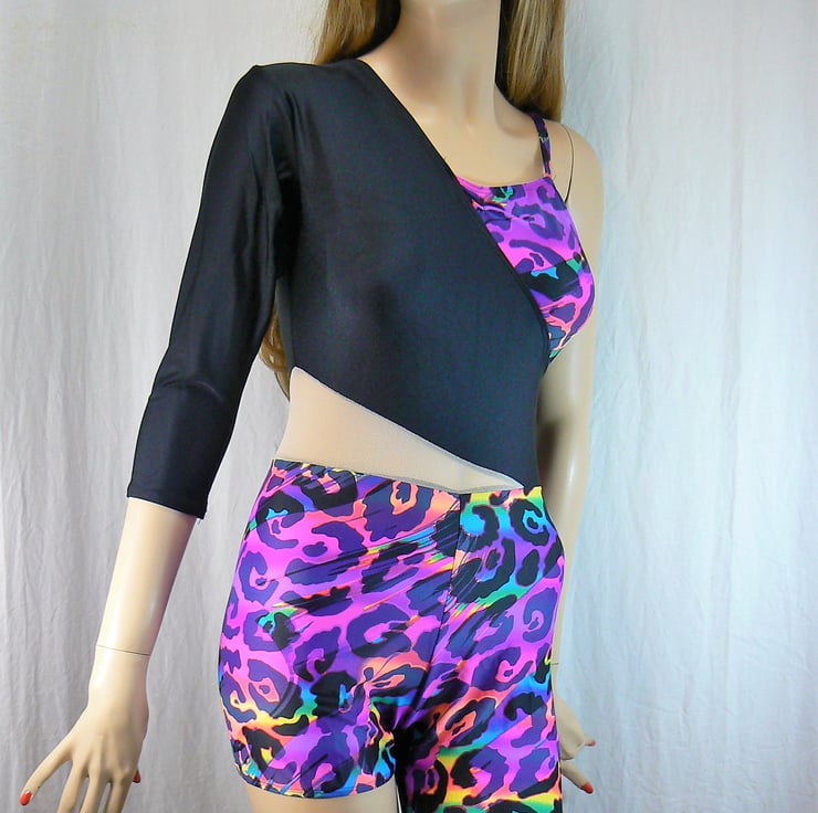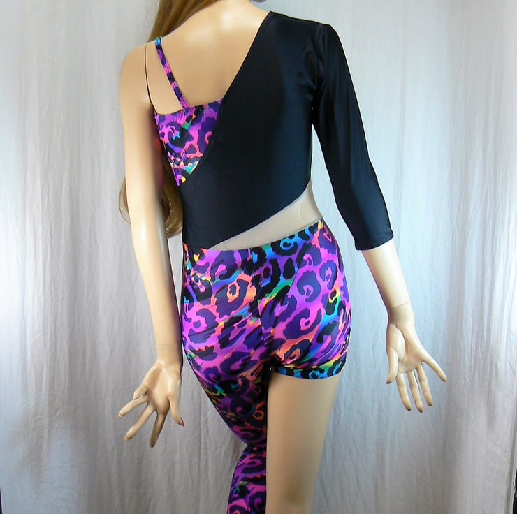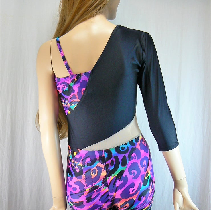 This costume is one shoulder/ camisole at the top and hot pant/catsuit legs at the bottom with three quarter length sleeve on the one shoulder side. This is black and multi coloured - a lovely rainbow leopard print. and has a skin mesh panel at the side.