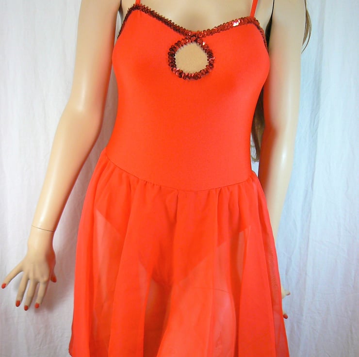 Red camisole dress with red sequin trim along the top edge. This dancewear dress has a dropped waist and has a chiffon skirt that has a hemline that is short at the front longer at the back