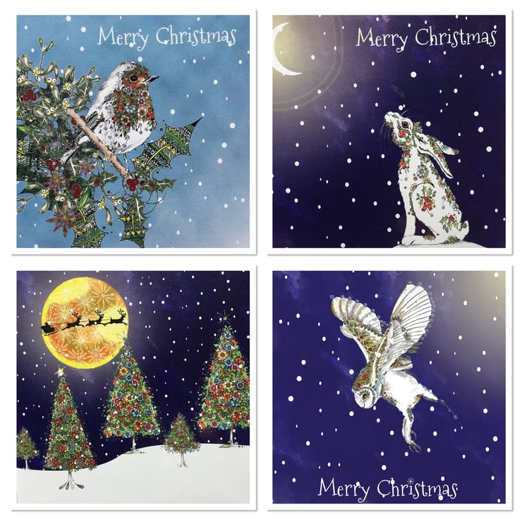 Robins, Christmas tree, fox, ptarmigan, stag, Barn owl, cinnamon wreath, holly berry wreath, peacock wreath, polar bear, pudding, hare, dark and snowy collection, .. this pack is based on a selection from all of my Christmas designs, not just the ones shown here.