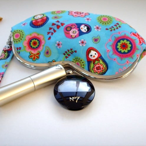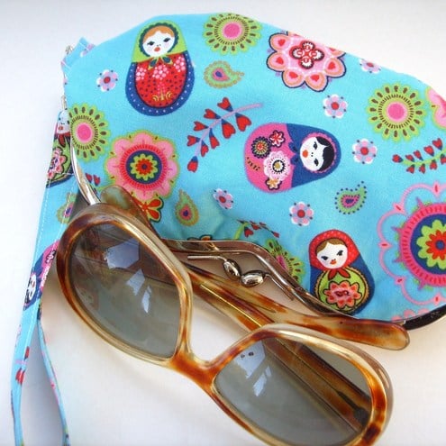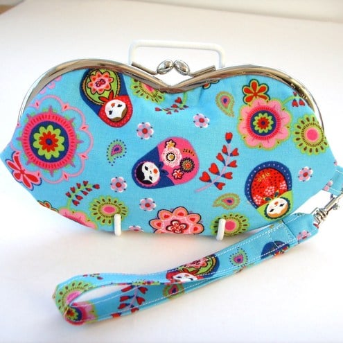 Charming little wristlet purse for sunglasses or mobile phone in pretty little Russian doll fabric with contrasting lining and removable wrist strap. Measures approx 7"x3.5"