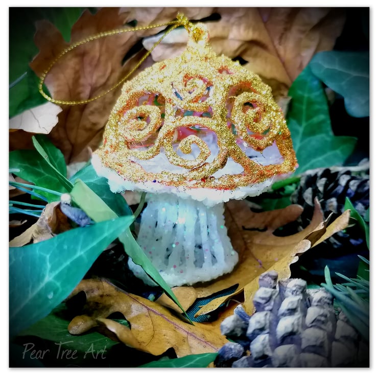 1 x Gold Toadstool Christmas decoration. Hand drawn 3D printed and painted toadstool. With loop for hanging decoration up.