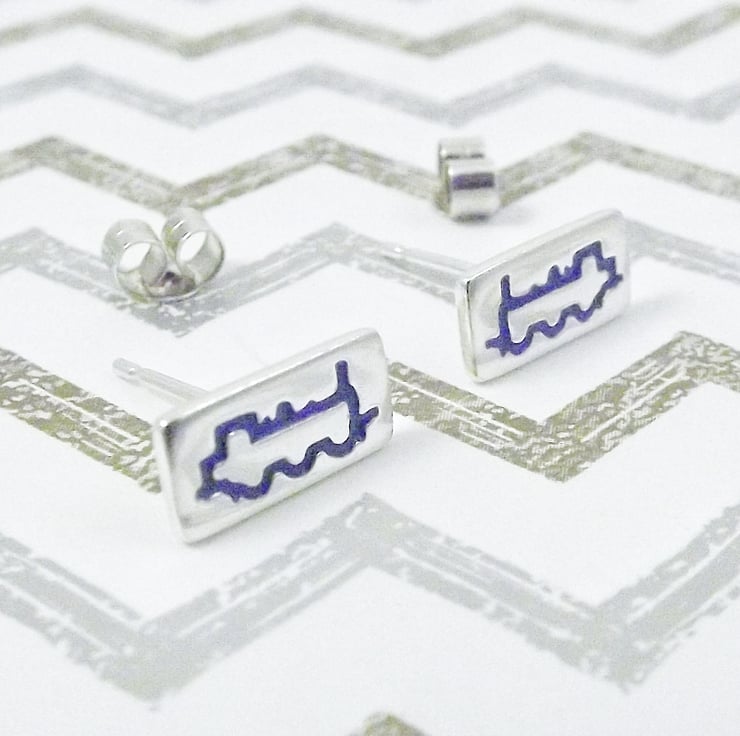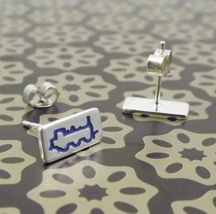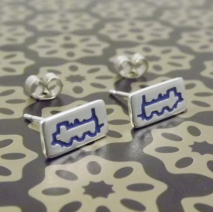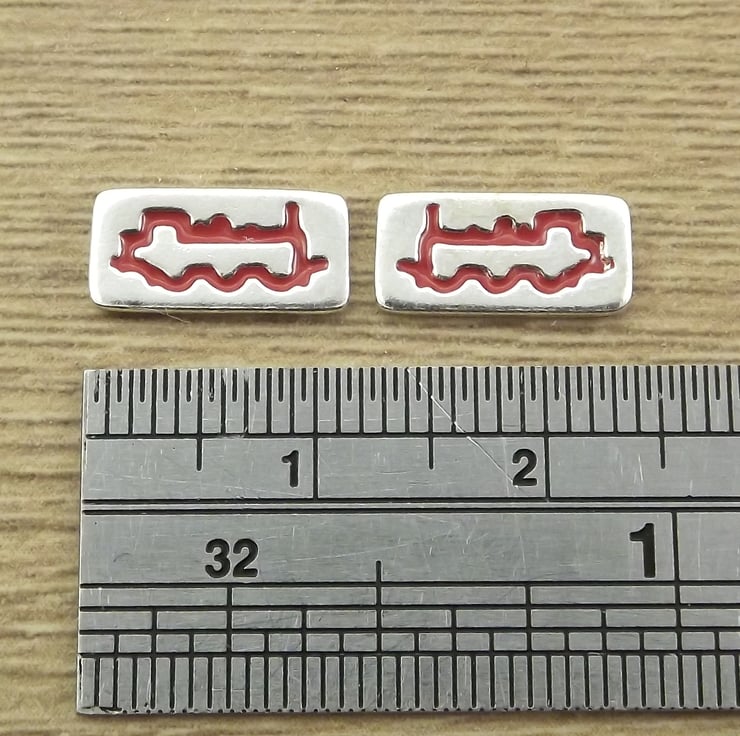 These stud earrings feature a side view of a steam locomotive and have been lovingly crafted by hand in Shropshire. They are made from recycled sterling silver and are etched before being cut by hand, the edges are then smoothed using files and emery paper before the 11mm ear pins are then soldered onto the back. A coloured resin based enamel is added to the etched areas and then the earrings are polished.