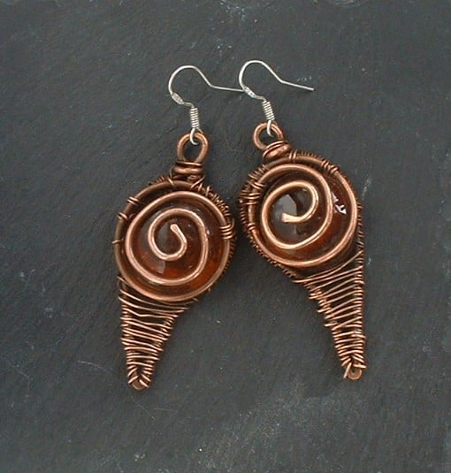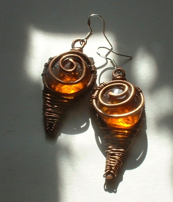 The glass nuggets are wrapped in lightly hammered copper wire using a spiral design. A copper washer at the back holds the glass in place and then they were wrapped together using a fine gauge copper wire.
