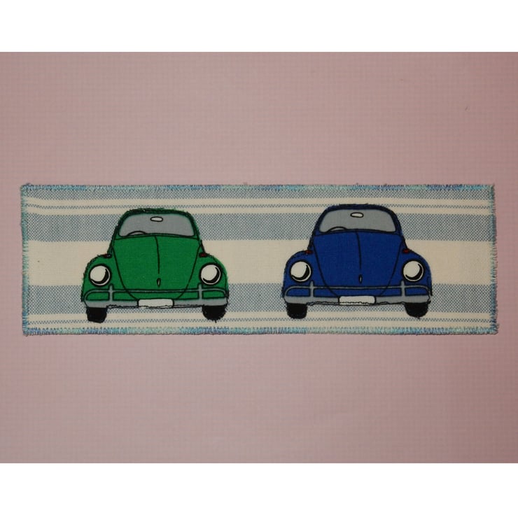 One for the Beetle (car) lovers, this fun fabric bookmark, which measures 2.5 x 8 inches. It is made from an attractive woven fabric, with two applique Beetle cars in green and blue. The edge is stitched in matching blue thread.